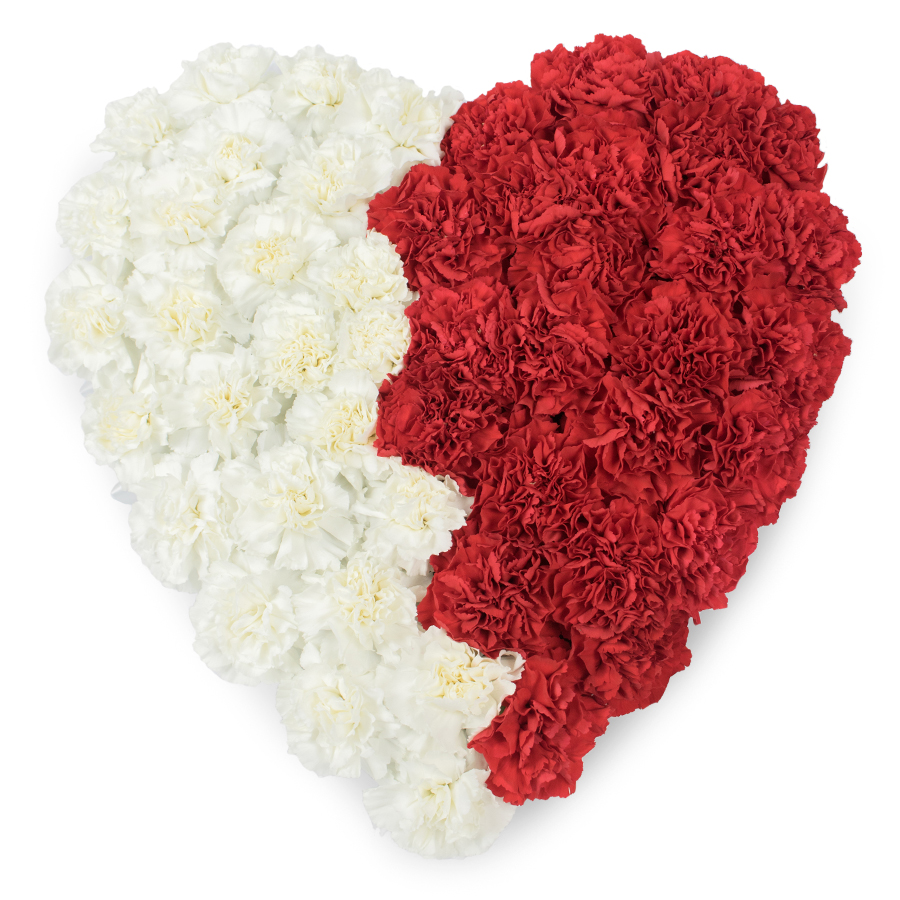 Our stunning heart arrangement features a harmonious blend of white and red carnations, meticulously chosen for their vibrant colors and exceptional quality. Each bouquet is hand-selected to guarantee freshness, creating a unique and beautiful statement for any occasion.