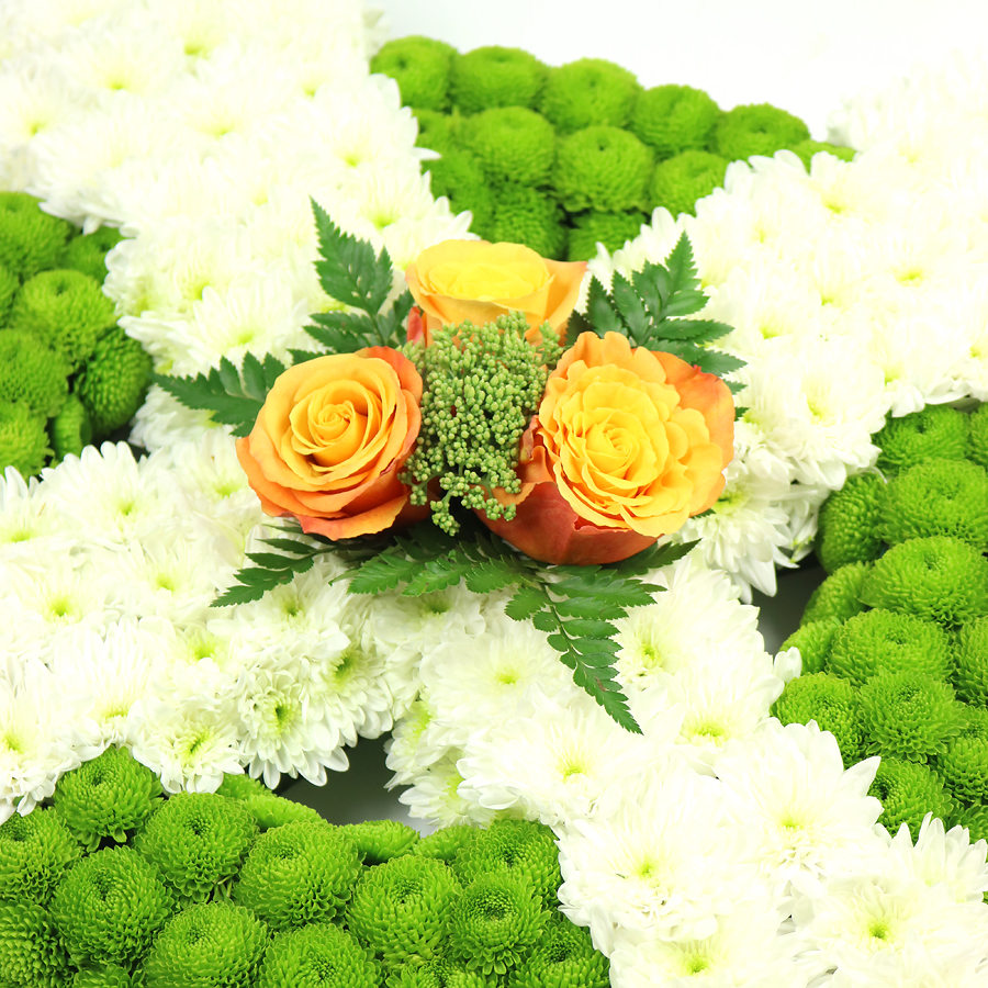 Our Exquisite Elegance Arrangement showcases a stunning combination of white and green spray chrysanthemums alongside vibrant orange roses. Each flower is hand-selected for freshness and maximum aesthetic appeal.